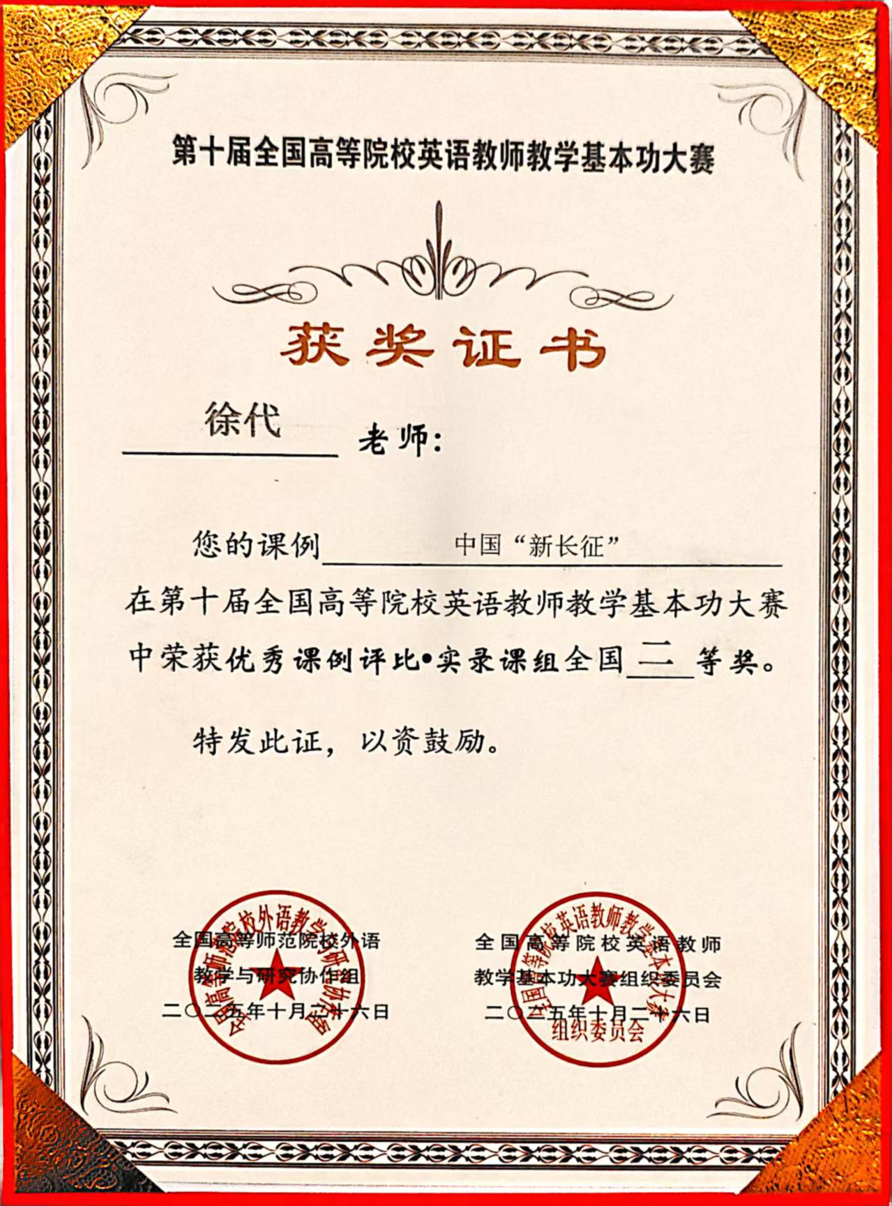 近日,第十届全国高校英语教师基本功大赛实录课现场总决赛在南京理工大学成功举办,长春光华学院外国语学院商务英语系教师徐代凭借一堂深度融合中国“新长征”精神理论信仰的教学课程,荣获全国二等奖。