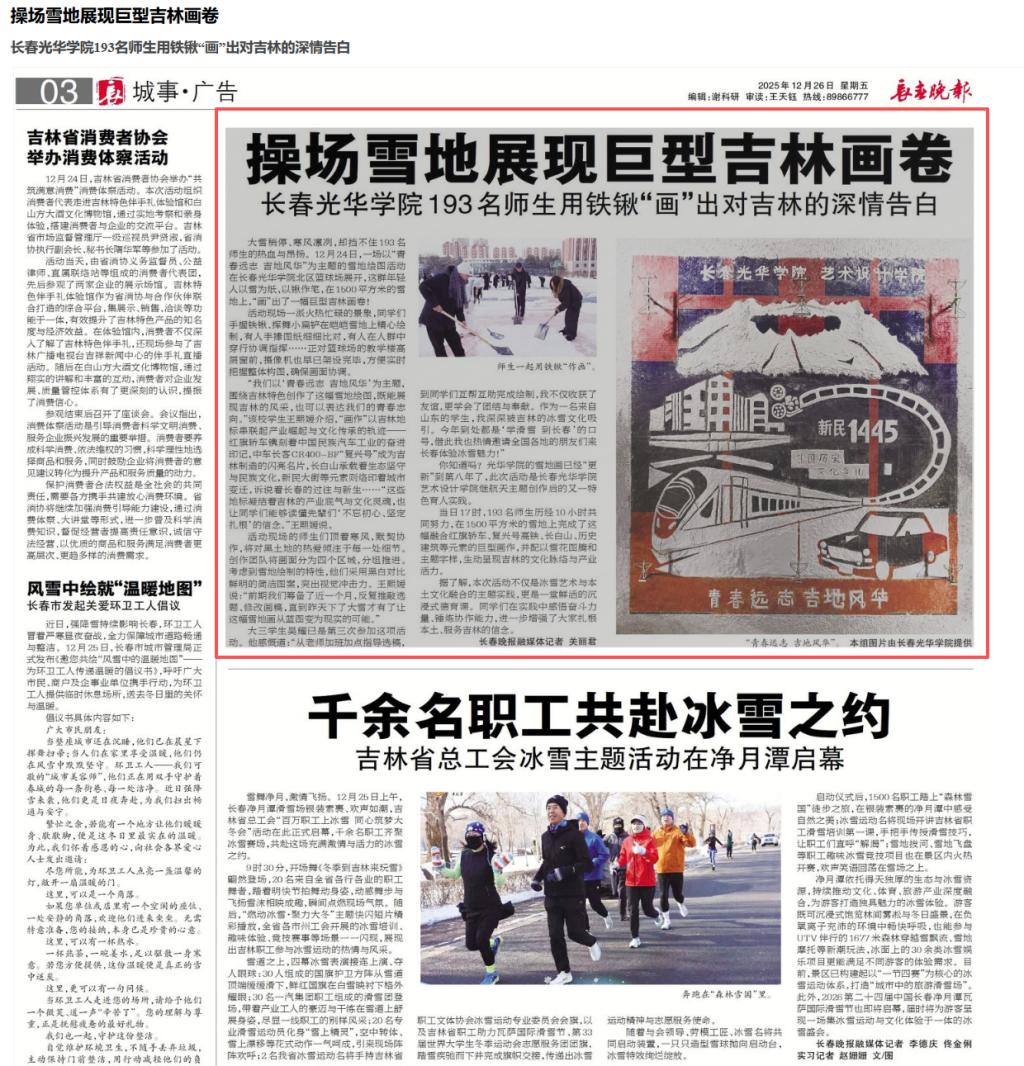 城市晚报|操场雪地展现巨型吉林画卷 长春光华学院193名师生用铁锹“画”出对吉林的深情告白