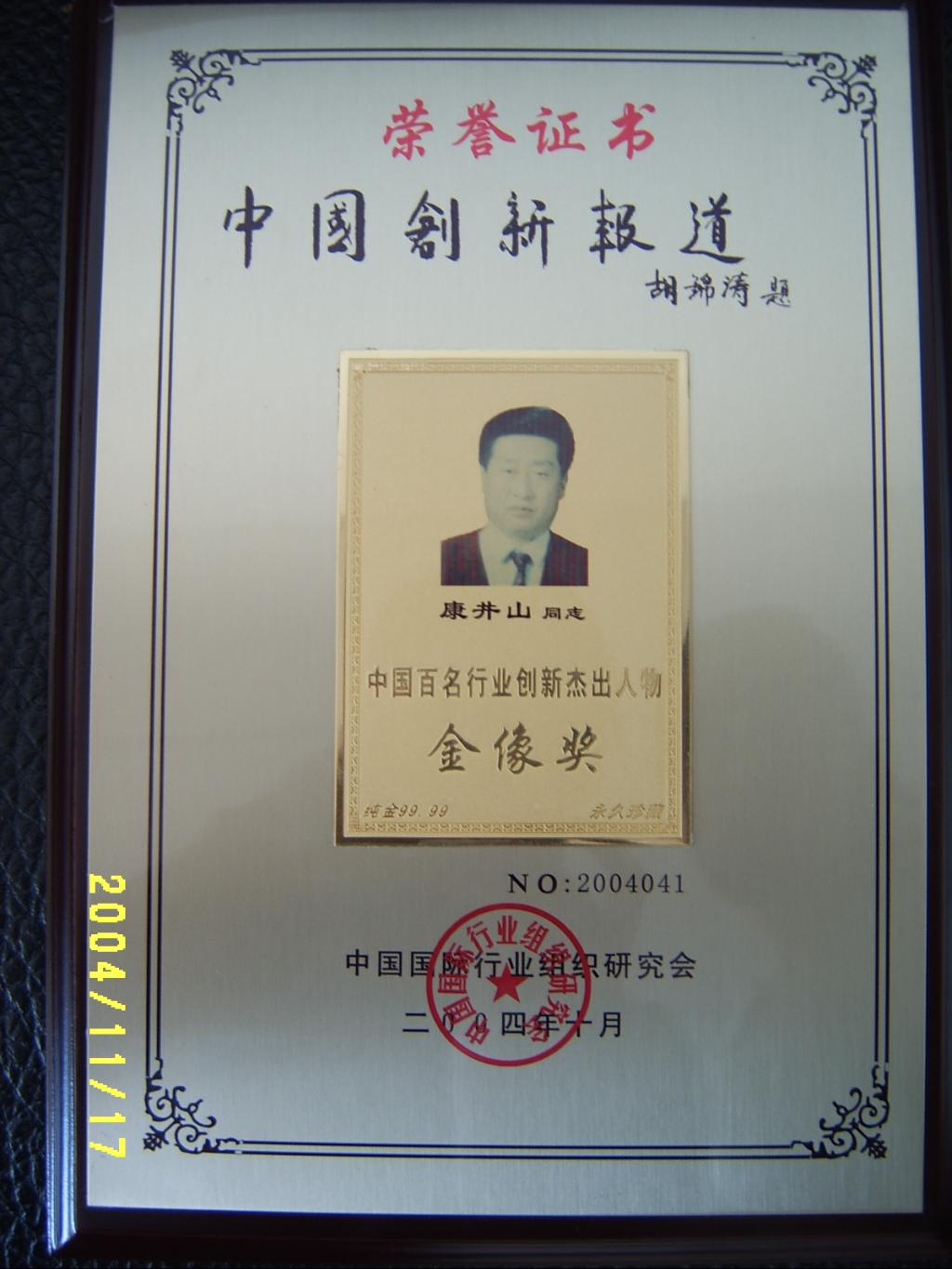 2004年,创始人康井山荣获“中国百名行业创新杰出人物金像奖”